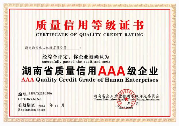 企業(yè)質量信用等級評定活動由省質量技術監(jiān)督局、省社會信用體系建設領導小組辦公室及省信用建設促進會聯(lián)合開展。2012年9月,湘東化機向省企業(yè)質量信用等評辦提交“省質量信用AAA級企業(yè)”申報材料并順利通過了文件初評,10月30日,省企業(yè)質量信用等評辦評審專家組對湘東化機進行了現(xiàn)場評定,評審組在根據(jù)公司的經(jīng)營狀況、標準化管理和企業(yè)標準體系建設情況、計量管理和計量檢測體系建設情況、企業(yè)售后服務體系建設及消費者意見反饋情況、合同履行情況、完稅情況、產(chǎn)品質量情況(如產(chǎn)品監(jiān)督抽查結果、各種質量認證情況、采標情況等)及近3年內企業(yè)規(guī)范經(jīng)營及獎懲情況,依據(jù)“公正、客觀、科學”原則,在對公司和產(chǎn)品進行全面了解、考察調研和分析的基礎上,對公司質量信用行為的可靠性、安全性程度作出綜合評價,最終經(jīng)評審組討論認定,湘東化機符合質量信用最高等級——AAA級企業(yè)評定要求,順利通過評定。