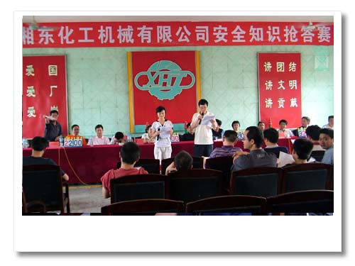 6月23日上午,我公司機(jī)安處舉辦了一期安全知識(shí)搶答賽,來自生產(chǎn)一線的容器隊(duì)、汽輪機(jī)隊(duì)等5個(gè)隊(duì)15名選手參加了比賽,以及50多名一線工人觀看了比賽。繼前期舉辦了外請(qǐng)人員觀看安全教育宣傳片、黑板報(bào)比賽、出一期宣傳櫥窗、張貼宣傳橫幅等活動(dòng)以來,這次比賽活動(dòng)將湘東化機(jī)6月安全月“關(guān)愛生命,安全發(fā)展”主題活動(dòng)再次推向了高潮。經(jīng)過2個(gè)小時(shí)的激烈角逐,汽輪機(jī)隊(duì)以300分遙遙領(lǐng)先奪取了冠軍。