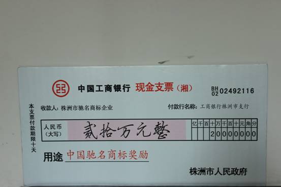 2013年9月6日,我公司參加了株洲市馳名商標(biāo)表彰大會,我公司因2012年獲“中國馳名商標(biāo)”受到通報(bào)表彰。(《株洲市人民政府辦公室關(guān)于表彰我市被新認(rèn)定為2011-2012年中國馳名商標(biāo)、湖南省著名商標(biāo)企業(yè)的通報(bào)》株政辦函[2013]85號),會上,我公司捧回“中國馳名商標(biāo)”牌,并受到株洲市人民政府給予表彰企業(yè)的20萬元獎(jiǎng)勵(lì)金。