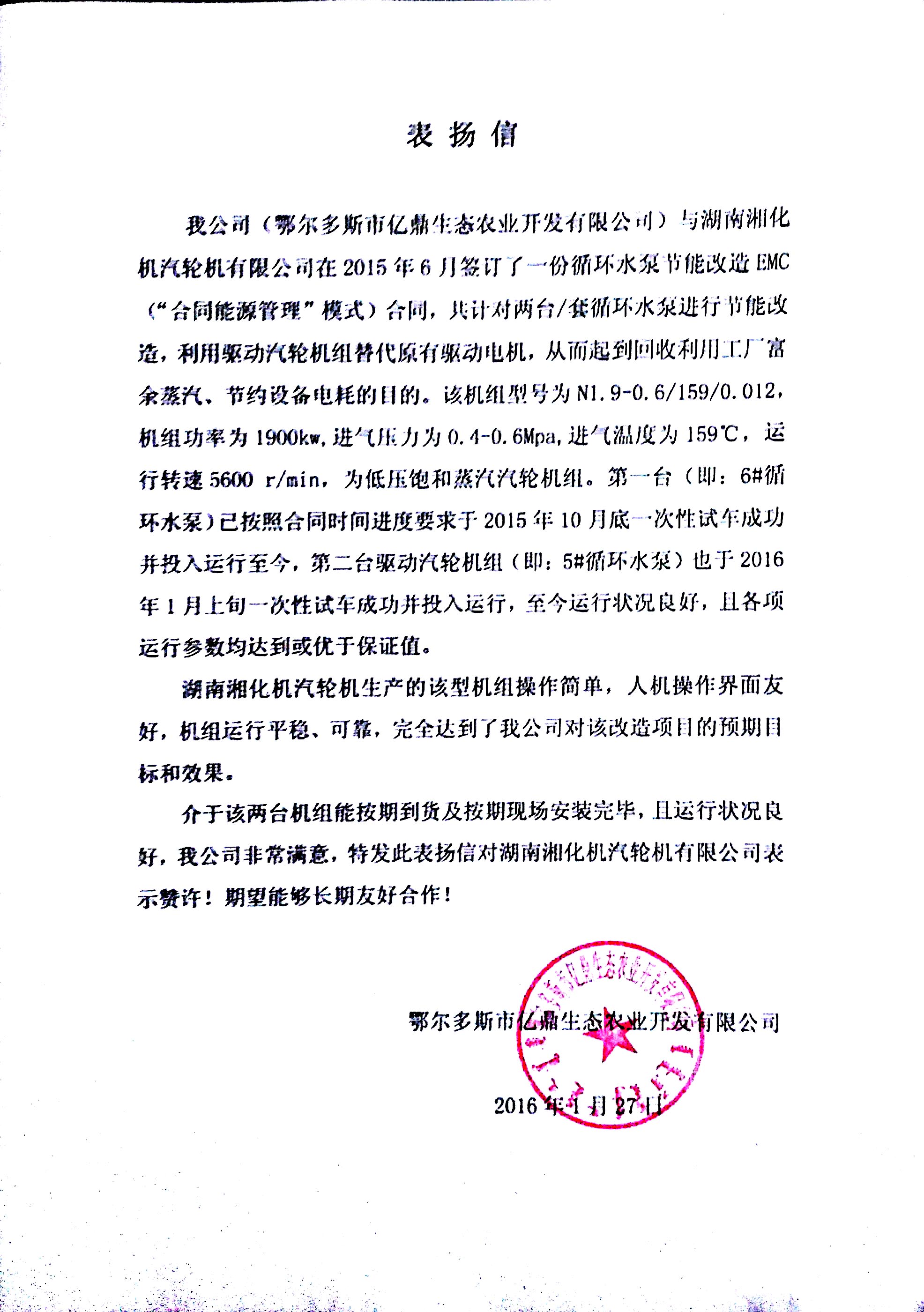 2016年1月27日,湘化機(jī)汽輪機(jī)公司收到鄂爾多斯億鼎生態(tài)農(nóng)業(yè)開發(fā)有限公司的表揚(yáng)信,表揚(yáng)汽輪機(jī)公司在2015年對億鼎生態(tài)農(nóng)業(yè)開發(fā)有限公司兩臺循環(huán)水泵的節(jié)能改造工作高度滿意,汽輪機(jī)公司利用驅(qū)動汽輪機(jī)組替代原有驅(qū)動電機(jī),該機(jī)組操作簡單,人機(jī)操作界面友好,機(jī)組運(yùn)行平衡,投入運(yùn)行后狀況良好,完全達(dá)到了回收利用工廠富余蒸汽、節(jié)約設(shè)備電耗的預(yù)期目標(biāo)和效果,并期望與我公司長期友好合作!